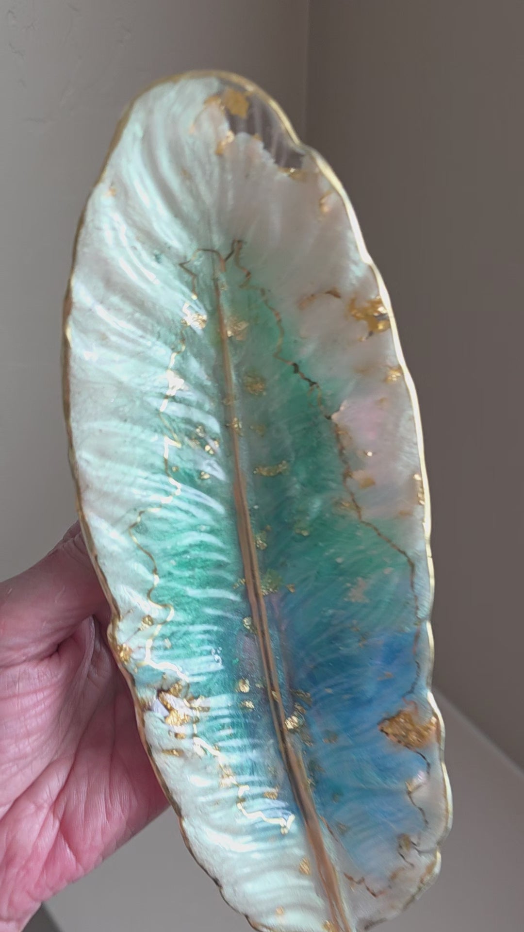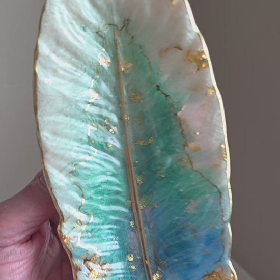 A shimmering blend of art and elegance, this hand-painted resin feather dish catches the light like a piece of captured sky. Shades of ocean blues, seafoam greens and pearlescent white flow together, kissed with hand-applied gold leaf and a refined golden trim. Each dish is one-of-a-kind, making it as unique as the soul who treasures it.