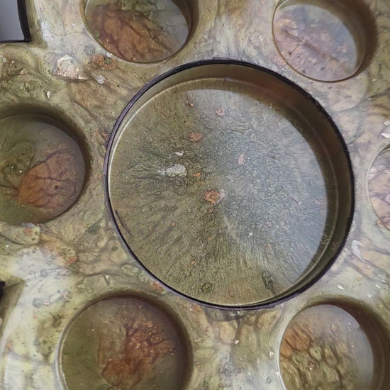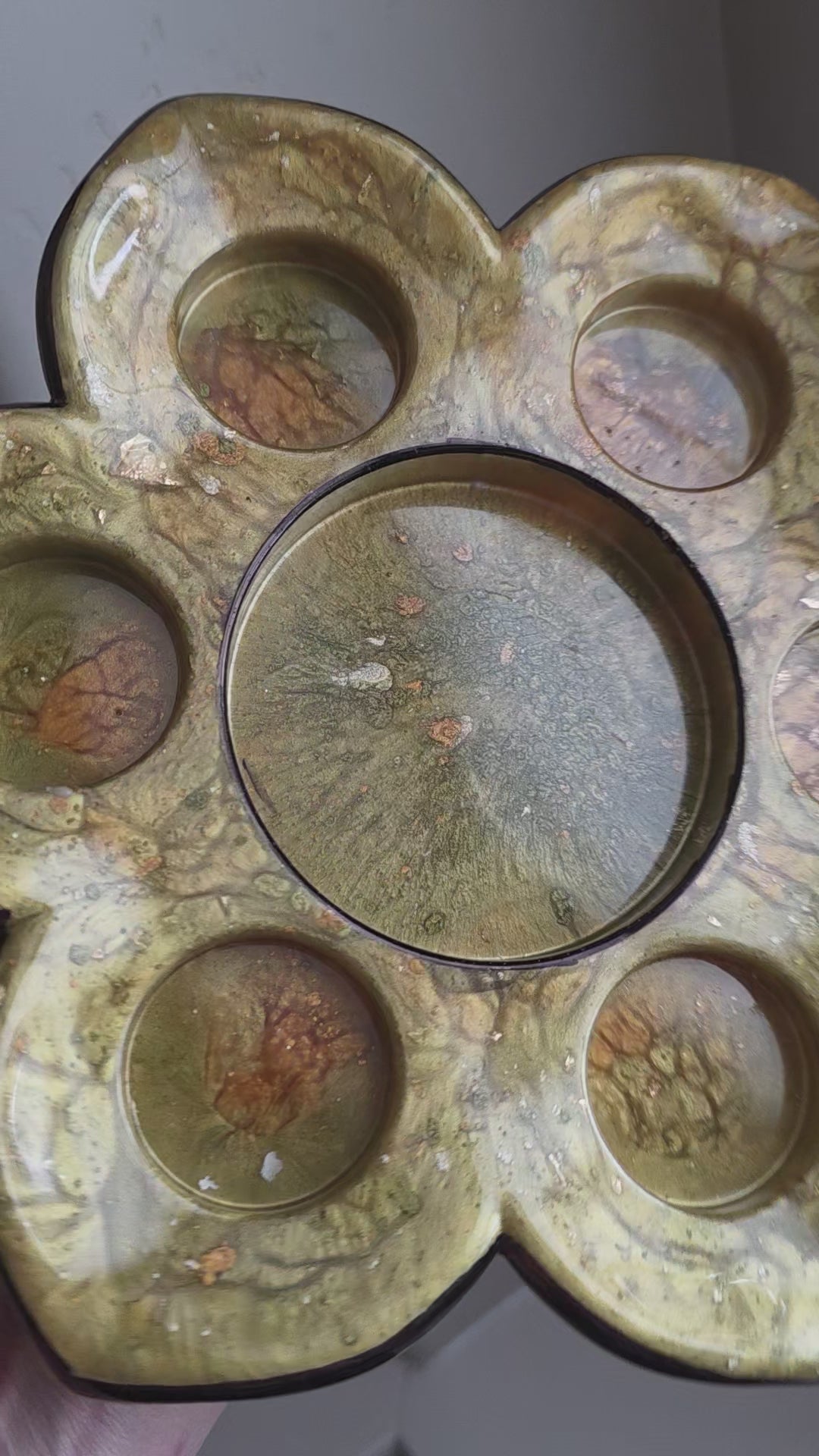 Bring serenity and glow into your space with this resin lotus candle holder, designed to hold one large candle in the center and five tealights around its petal-shaped frame. Handcrafted with a marbled blend of green, gold, and copper resin, this piece radiates warmth while doubling as a stunning decorative centerpiece.