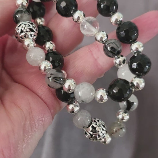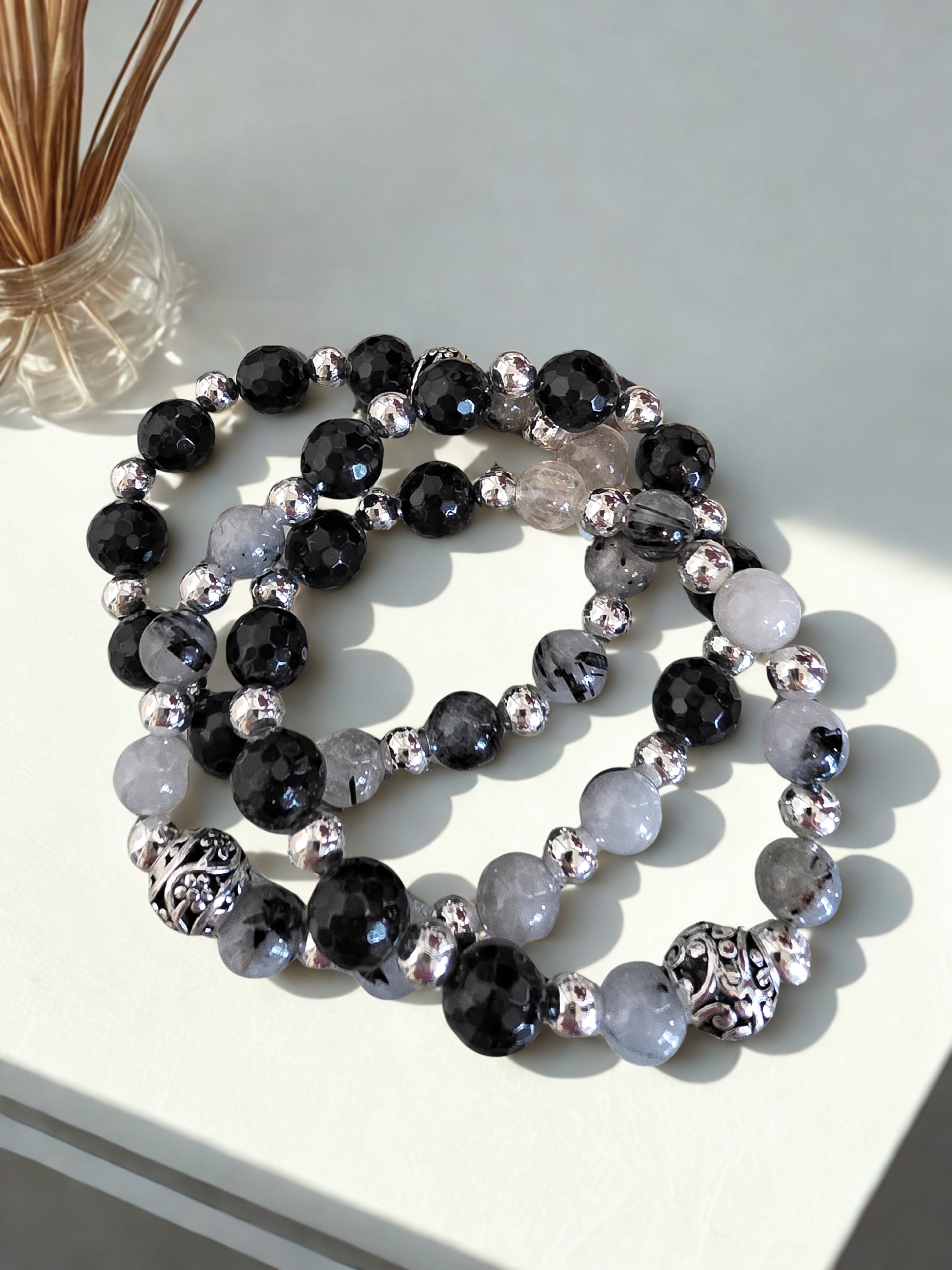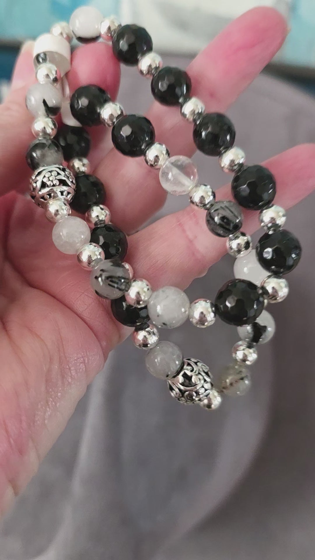 Find balance and clarity with this handcrafted Tourmalated Quartz stretch bracelet — a powerful fusion of Black Tourmaline and Clear Quartz. Each stone is naturally unique, combining protection and purification in one striking design.