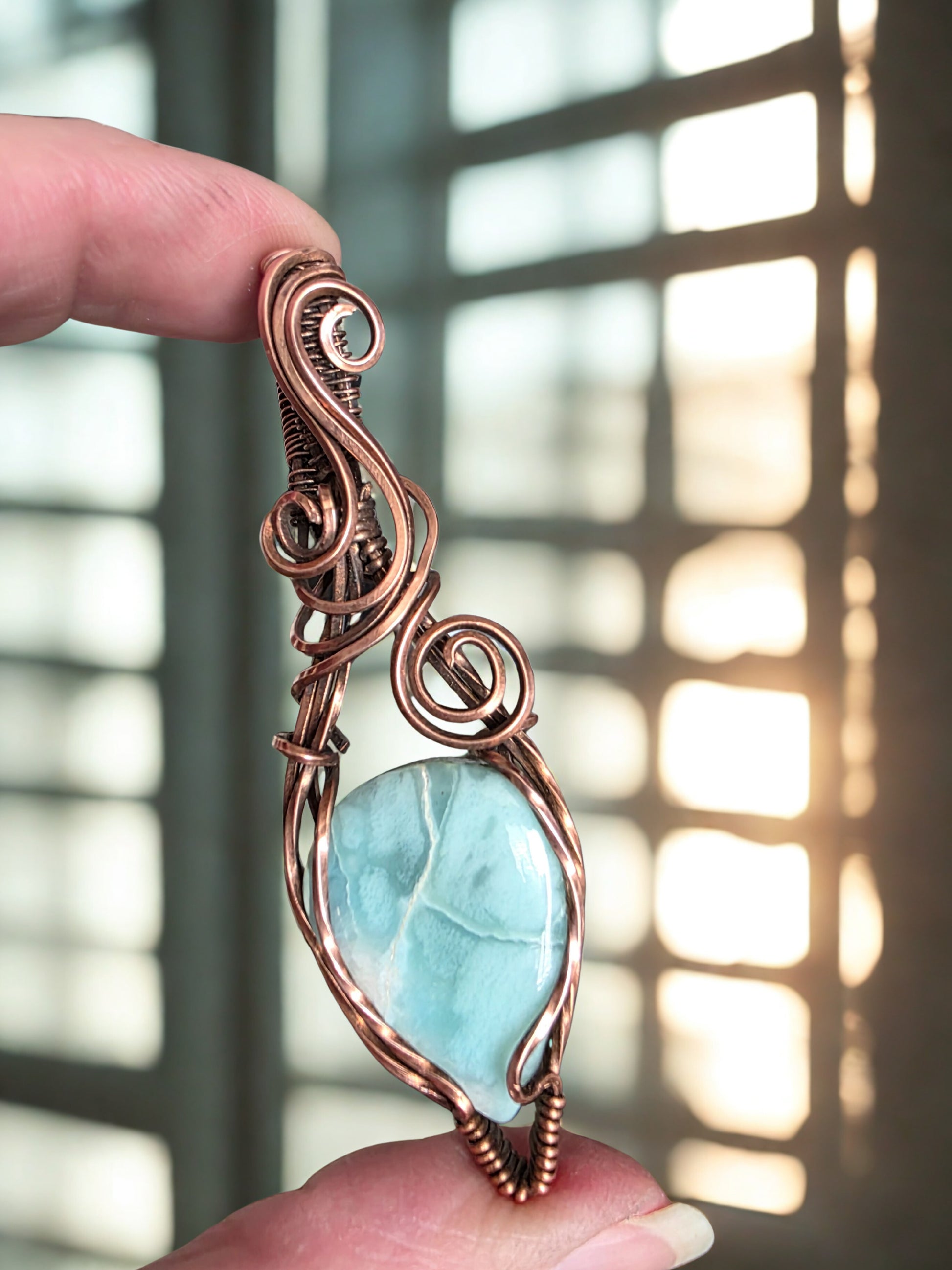 Larimar pendant, larimar necklace, healing crystal jewelry, handcrafted copper jewelry, throat chakra stone, calming gemstone necklace, artisan wire wrapped pendant, spiritual jewelry gift